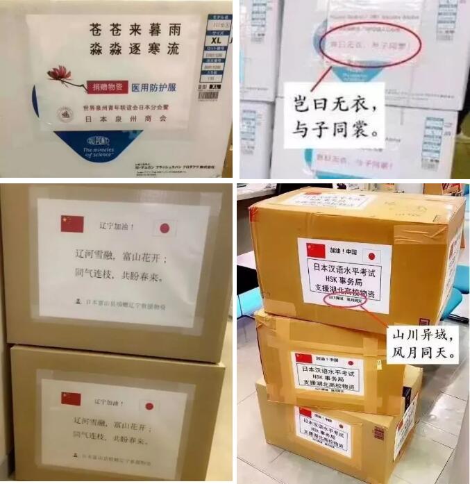 日本政府在疫情開始的第一時(shí)刻,就保證會幫助中國渡過難關(guān)。日本株式會社捐贈(zèng)了3300套防護(hù)服、6000雙鞋套、賦詞豈日無衣,與子同裳。富山縣向友好省縣遼寧省捐贈(zèng)了一萬枚口罩,上面寫著:遼河雪融,富士花;同氣連枝,共盼春來。HSK事務(wù)所捐贈(zèng)了兩萬枚口罩,上面寫著:山川異域,風(fēng)月同天。
