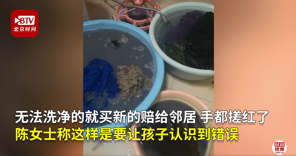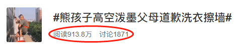 事情發(fā)生后,熊孩子的父母“兵分兩路”迅速補(bǔ)救:孩子?jì)寢寧е⒆影ぜ野羟瞄T道歉,并承諾把臟的衣服讓孩子手洗恢復(fù),孩子爸爸請(qǐng)高空作業(yè)的保潔公司幫忙恢復(fù)墻體,要求孩子一直站在太陽(yáng)底下看著,直到清潔工人清潔完畢,方可離開(kāi)。