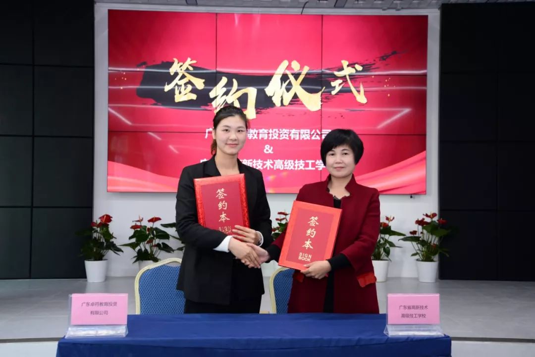 廣東卓符教育投資有限公司蓓蕾實(shí)驗幼兒園園領(lǐng)導(dǎo)游堯與廣東省高新技術(shù)高級技工學(xué)校執(zhí)行校長肖中圓簽定合作協(xié)議。