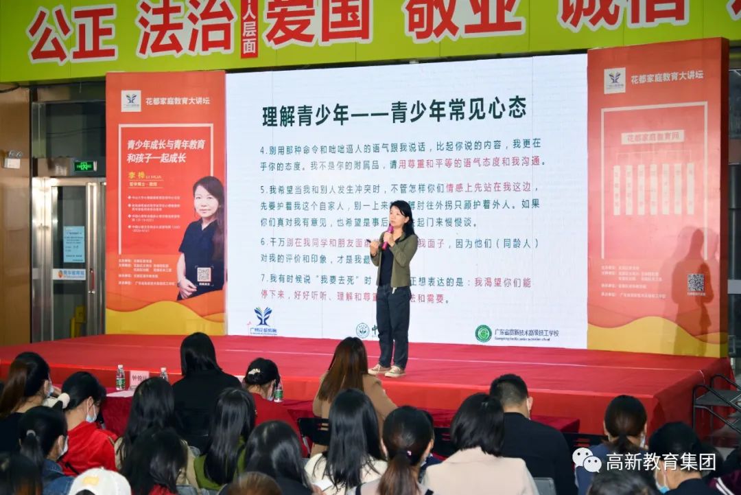 11月28日,由花都區(qū)教育局主辦,經(jīng)花都區(qū)文明辦、花都團(tuán)區(qū)委、花都區(qū)婦聯(lián)、花都區(qū)關(guān)工委、廣州市家庭教育促進(jìn)會(huì)等單位的全力支持,廣州高新教育集團(tuán)旗下學(xué)校廣東省高新技術(shù)高級(jí)技工學(xué)校承辦的花都家庭教育大講壇第4講“青少年成長(zhǎng)與青年教育 與孩子一起成長(zhǎng)”在花都區(qū)南華教育城正式開(kāi)講。
